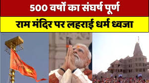 रामलला की प्राण-प्रतिष्ठा के ठीक 673 दिन बाद आज प्रधानमंत्री नरेंद्र मोदी ने राम मंदिर के मुख्य शिखर पर धर्म ध्वजा फहराई। अभिजीत मुहूर्त में पीएम के बटन दबाते ही 161 फीट ऊंचे शिखर पर 2 किलो वजनी विशाल केसरिया ध्वज लहराने लगी। जय श्री राम के नारों से अयोध्या नगरी गुंजायमान हो गई।