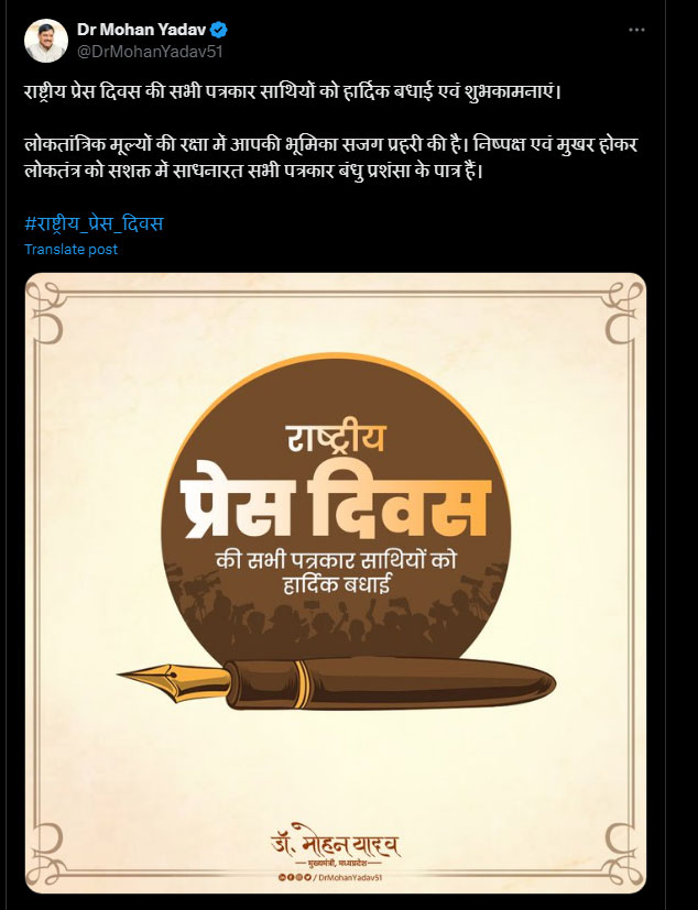 मुख्यमंत्री डॉ. यादव ने राष्ट्रीय प्रेस दिवस की हार्दिक बधाई एवं शुभकामनाएं दीं